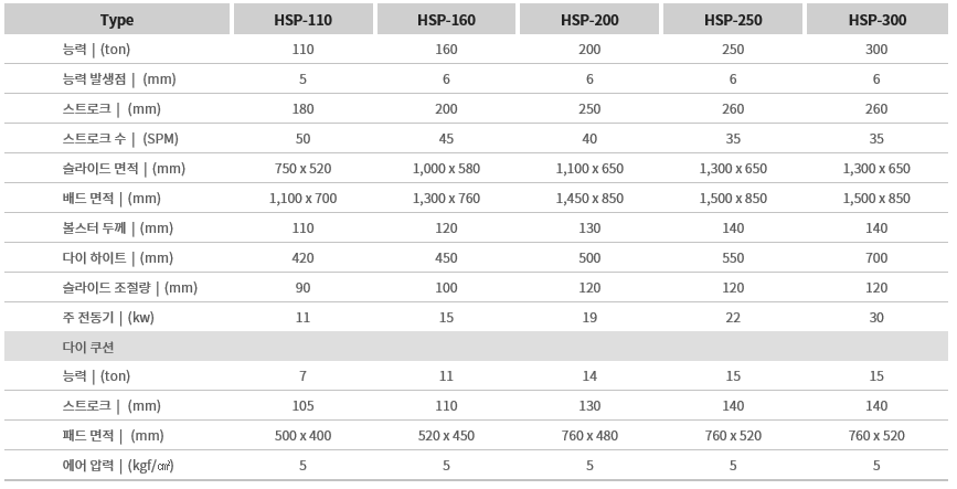 HSP 시리즈는 크랭크프레스에서 가장 중요한 동적 정밀도가 보장되며 뛰어난 조작성과 각부의 합리적인 구조는 범용 가공, 프로그레시브 가공, 트랜스퍼 가공과 같은 무인화 작업 실현에 필요한 모든 요건을 갖추고 있습니다.